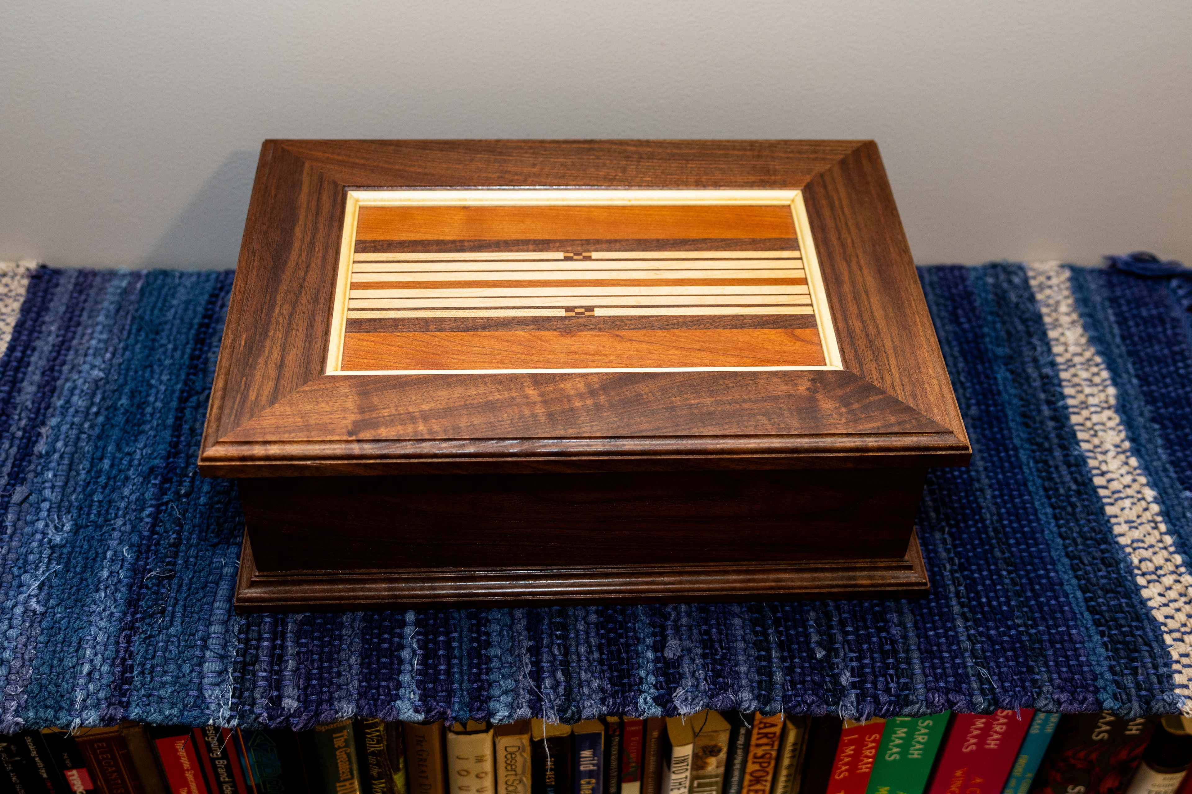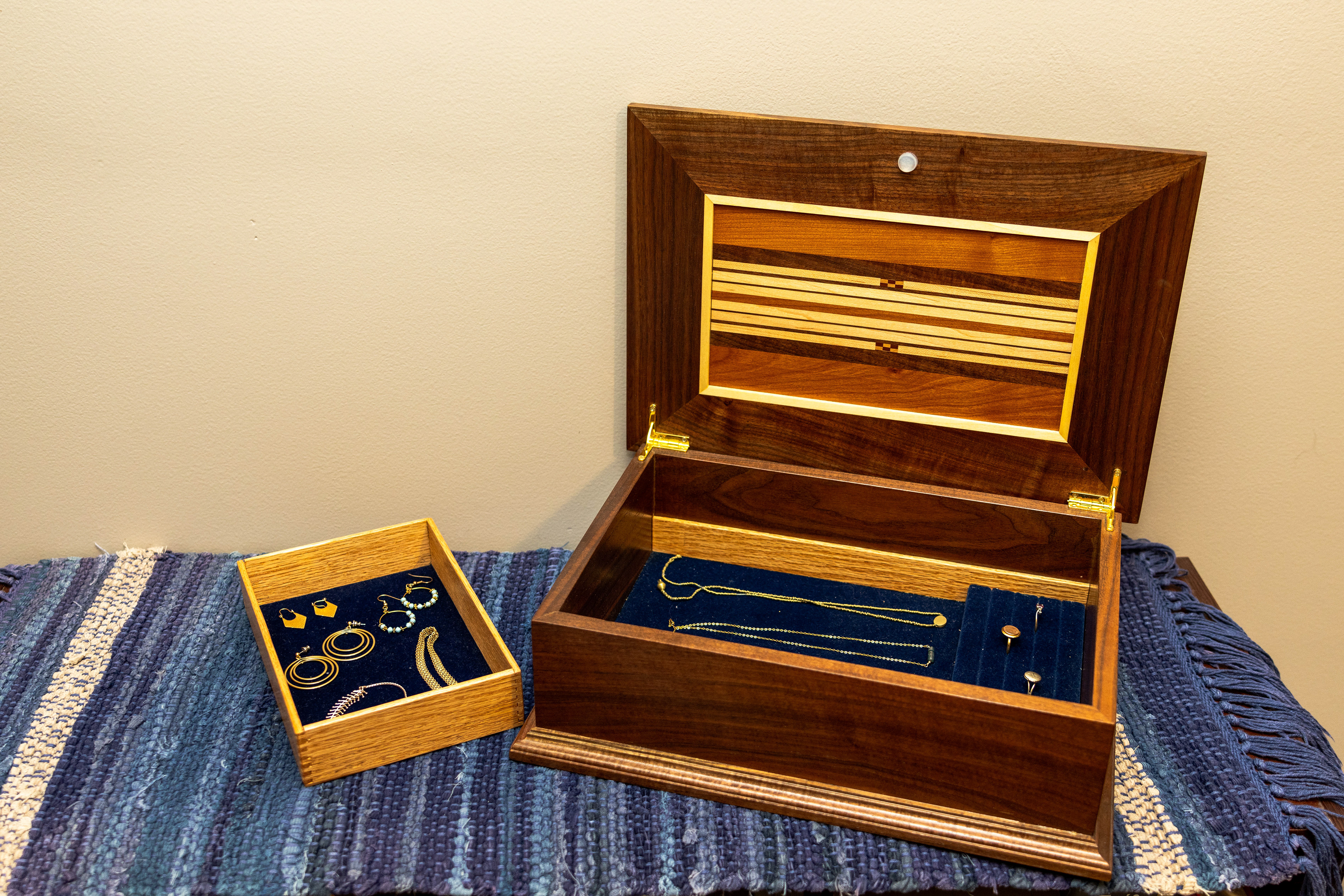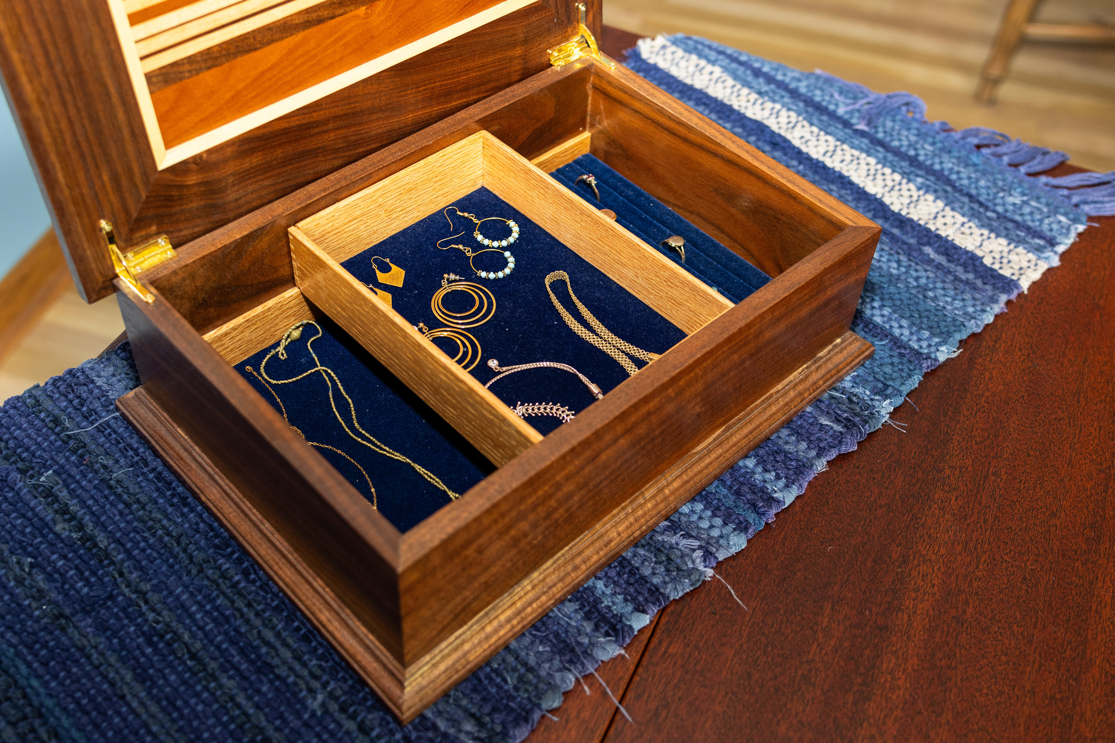 Custom jewelry box with handcrafted details, movable interior shelf